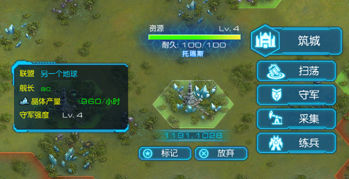 显示为绿色,可以进行筑城,扫荡,守军,采集,练兵,标记,放弃指令