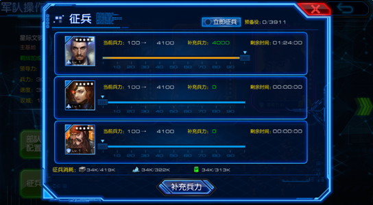 指挥官配置到部队后,在所属城市时可进行征兵增加兵力。指挥官每升1级,可征召部队兵力上限增加100,建筑设施也提供兵力上限提升。征兵需要消耗游戏资源、以及花费时间等待。游戏同也提供立即征兵功能消耗掉预备役兵数以及资源,不需要时间等待立即补充兵力。