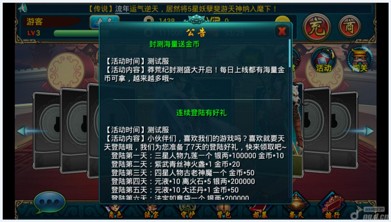 在更精品的制作、更多样有趣的玩法以外,最新开放法宝注灵功能,更有免费战斗加速功能、多套阵容保存功能、首创周卡奖励、扫荡功能优化等。在游戏优化上我们从未止步,只为带给您更好的游戏体验。全新起航的《莽荒纪2.0》邀您来战![详情]