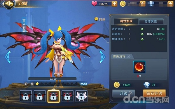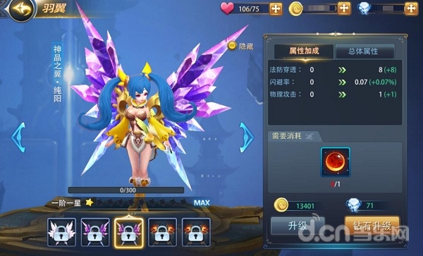 玩家可以消耗道具来升级自己的翅膀, 翅膀的等级越高,就越华丽。