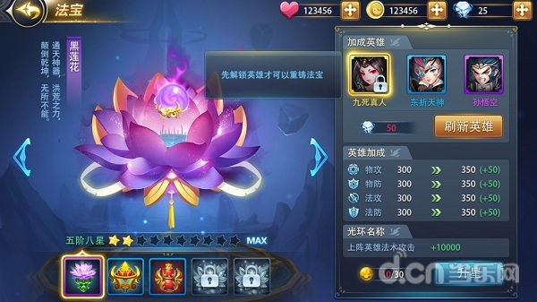 法宝可以给3名特定的英雄提供属性加成,如果对这3名英雄不满意,还可以刷新成其他英雄。