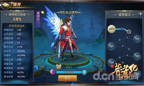 游戏中的每个主角都有各自的境界,通关困难副本可获得神识,提升境界等级。达到规定数值后,还可突破境界。当达到固定等级后,需要进行渡劫战斗,战斗胜利后,境界继续提升,并获得额外属性,增加全队战斗力。