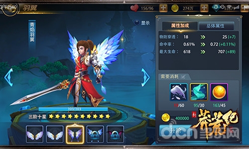 羽翼可为玩家提供额外属性,其升级也需要对应的道具。当升到一定等级后,还可进行升阶;阶层越高,羽翼的造型越多,增加的属性也越多。