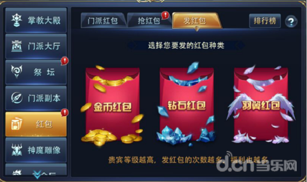 红包嗨翻天,每日免费送红包,每日可以在帮派中领取不同的奖励,金币、钻石、羽翼红包。每日一定记得领取哦!不单单可以领取游戏系统发放的红包。还可以领取各位帮众发放的红包,红包一个都不能少。
