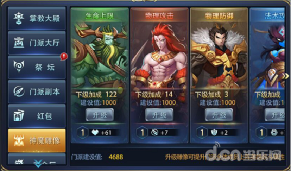独乐乐不如众乐乐,有些“无私”统统在这里。在门派中____神魔雕像,升级雕像可以全部为门派全体成员上阵英雄增加英雄属性。不同等级增加属性不同,等级越高升级的属性增加越多。