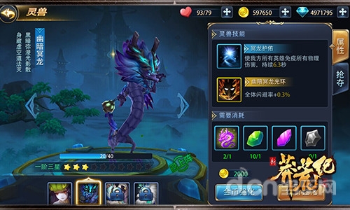 深藏虚空道法灭,黑暗弥漫光影散。幽暗冥龙拥有两大灵兽技能,一是“冥龙护佑”,可使己方所有英雄免疫所有物理伤害;二是“幽暗冥龙光环”,可使己方全体闪避率提升。通过对幽暗冥龙的升阶和强化,还可不断提升其属性及技能效果。带着这样一只大家伙闯荡莽荒世界,光是气势就要吓死敌人了吧!