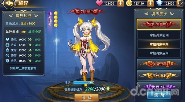 玩家的日常活动都产生一些神识,当神识达到一定程度的时候,便可以提升境界, 境界可以给主角与上阵英雄提供属性加成。