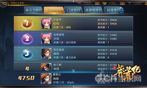 竞技场排行则是记录了“竞技场”玩法中获得前50名的玩家,且排行榜会根据排名的变动而刷新。