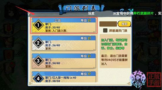 等级越高的门派,在门派列表中的排名将越靠前,玩家在选择门派的时候,会优先考虑选择排名靠前的门派。因此,门派掌门们要想办法将自己门派的等级提升,争取排名靠前,这样门派才能得到更好的发展。