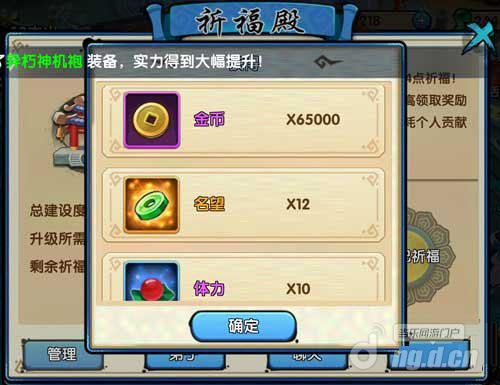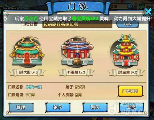 门派中包括大殿、祈福店和宝阁三块。其中大殿中捐金币、勾玉来获得贡献值,然后可以在宝阁中购买道具。而祈福店随着门派等级提高,获得的奖励也越多。时间在8点-24点之间哦。