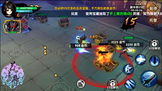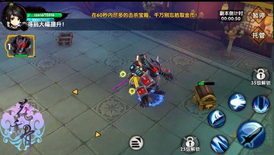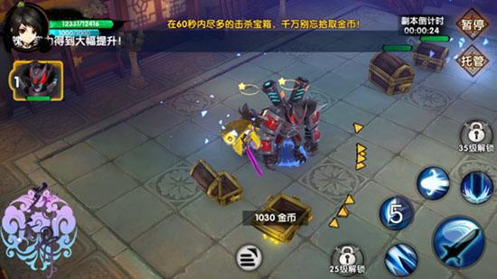 进入金库探宝副本大家可以看见副本中有许多的宝箱,控制好人物角色攻击宝箱,打爆箱子过后会爆出金币。金库探宝副本只有60秒的副本时间。因此,大家要在60秒的时间内,控制好人物角色尽可能打爆更多的箱子,进而拾取更多的金币。
