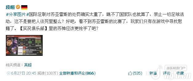 而段暄在不久之前也发布了一条调侃乌拉圭球星苏亚雷斯的微博,其中也提到了网易的正版足球手游《实况俱乐部》,这是否意味着段暄已经携手《实况俱乐部》,与他的同行,足球名嘴王涛一样加盟游戏,为游戏担当解说呢?而网易也并未让球迷们多等,随后官方宣布了段暄成为《实况俱乐部》“首席鉴卡师”的消息。