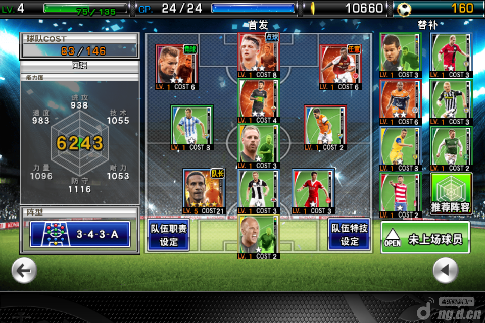 用一款卡牌游戏来表现一款足球游戏,开始让人觉得挺奇怪。等进入游戏你会发现,游戏的玩法只不过是将卡牌收集与策略经营融合在了一起而已,然后再给他披上了一件足球的外衣,可能跟《足球经理》系列有些类似,但内容绝没有这么繁琐,你所找做的依然要秉承卡牌游戏的传统,收集球星到升级战力再收集球星,这一标准式的卡牌模式来进行游戏,本身上也许没有太多的创意和亮点,但是结合足球的元素之后,却给游戏带了一些不一样的新意。足球游戏广泛使用的球员能力和相对位置等设定也移植到了游戏中来,因此卡牌也就有了能力值和位置适应性的区别,一个球员想要发挥出最大实力,玩家必须把他放在它熟悉的位置才行,这样的设定也更加贴近现实,更符合“实况”的定义!
