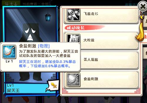 和大多数伙伴一样,屎天王的被动技能也都是提升主攻技能的效果,“大盐粒”是提升盐爆术的伤害,每一级的提升便硬性提升20点的伤害,还是比较实在的。而“丢人现盐”则有些鸡肋,因为需要屎天王用“飞盐走匕”杀死敌方后才有效果加成,如果没有杀人,就只能呵呵了,所以不能过分期待效果,玩家需要慎重提升,而“食盐刺激”则是比较靠谱的技能,屎天王在场上便可给全团增加暴击率,并且随着等级不断提升暴击效果,因此到中后期,屎天王对团队的整体的贡献会变得非常显著。