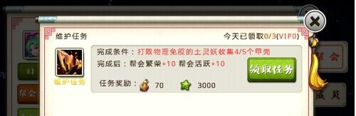帮会任务主要分成2种,一个是维护任务,每天可以都可以领取,普通玩家每天可以领取3次。还有一种就是建设任务,需要帮助开启建筑的升级或者建设才可以领到;