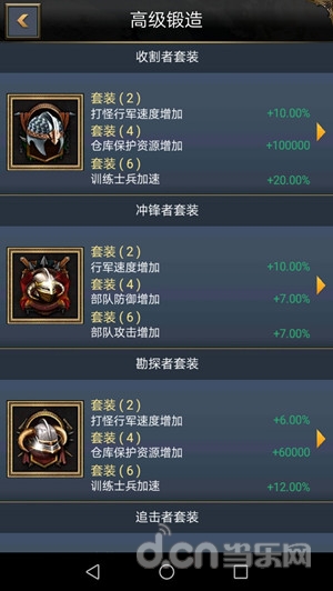 锻造装备需要装备材料、子装备、钢材三种物品。装备材料:每种装备材料对应一种装备属性,不同装备根据属性的不同,锻造所需的材料也不同。枫木,提高建筑建造速度,玫瑰石,提高科技研究速度,骨头,增加农田产量,布料,提高部队负重,石榴石,增加陷阱攻击,青铜,增加步兵攻击。琥珀,增加骑兵攻击,兽角,增加弓兵攻击,钴矿石,增加车兵攻击,翡翠,加快行军速度,毛皮,增加急救帐篷容纳人数上限,草药,加快伤兵恢复速度。
