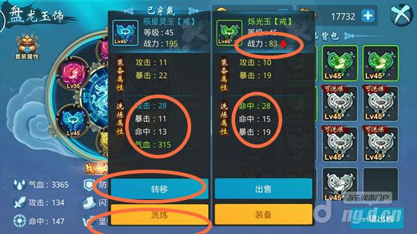 对比下左右两边,如果普遍属性右边高,那么转移过去。转移这个要小心用,因为一旦转移就转不回来了,看错或者手抖,战斗力下降几百点就找个厕所哭吧。