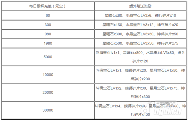 活动说明:活动期间,玩家每日充值累计达到对应档位,可领取对应奖励!