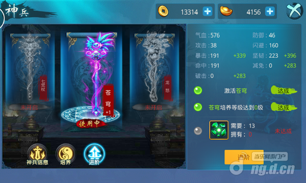 然后通过神兵培养进阶,属性才会慢慢显露。那啥,文艺一点,十年磨一剑嘛,慢慢磨,绝对是把神兵利器,超级情怀有木有。