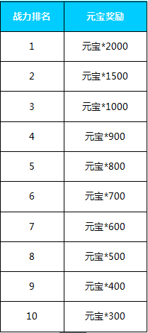 活动时间:开服前7天活动说明:开服7天内,玩家在全服战力榜中排名前十,即可获得丰厚元宝奖励!领取方式:结算之后游戏内活动界面结算之后即可领取