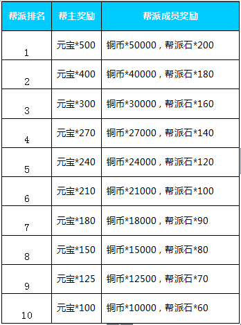 活动说明:活动说明:开服7天内,帮派榜排名前十,即可获得丰厚奖励!