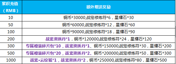 活动时间:开服前7天活动说明:开服前7天,累积充值达到对应额度,即可领取超值奖励礼包!活动奖励: