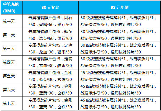 活动说明:开服前7天,每天单笔充值达到对应额度,可领取超值奖励礼包!活动奖励: