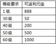 活动奖励:1. 修行基金:花费1000元宝即可购买修行基金,超额返还263%,达到对应等级要求即可在活动界面领取对应元宝奖励: