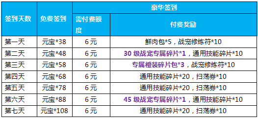 活动说明:开服7天内,每天登陆游戏可累积签到奖励,同时还有豪华签到满足您的双重需求!