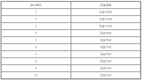 活动说明:开服7天内,玩家在全服战力榜中排名前十,即可获得丰厚元宝奖励!