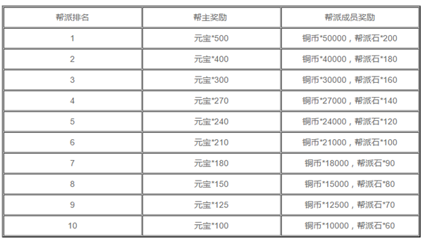 活动说明:活动说明:开服7天内,帮派榜排名前十,即可获得丰厚奖励!