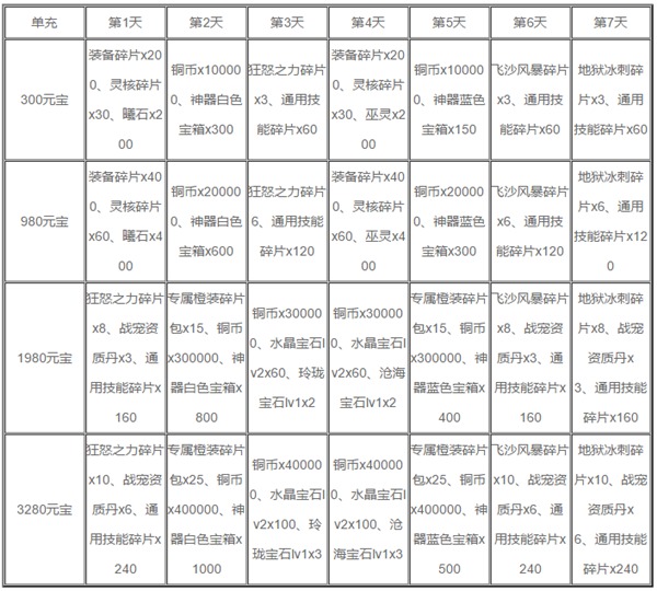 活动说明:开服前7天,每天单笔充值达到对应额度,可领取超值奖励礼包!