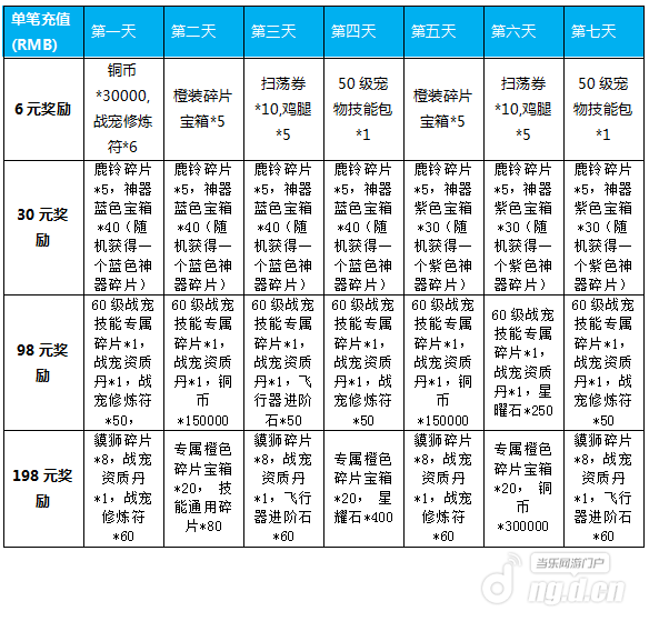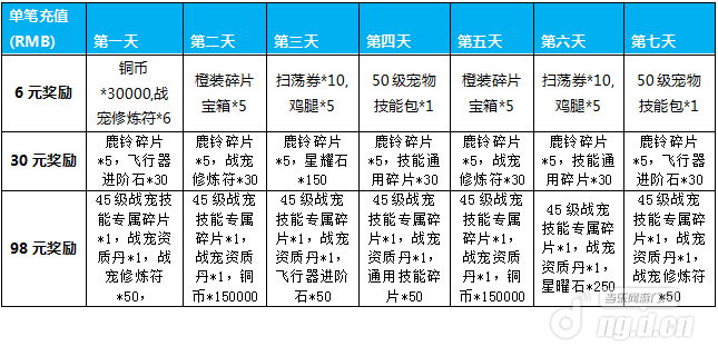 活动说明: 活动期间内,单日单笔充值达到指定要求,即可领取对应礼包奖励,每个奖励每日可领取一次,奖励每日刷新!