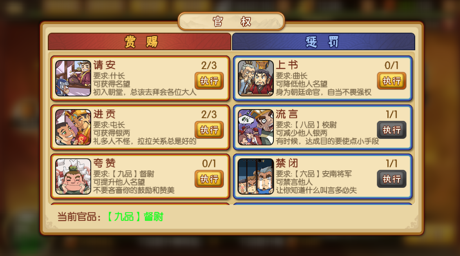 官品等级越高,主公就能拥有更多的官权,执行不同的官权可获得不同的奖励,还可以帮助或是陷害其他玩家噢~