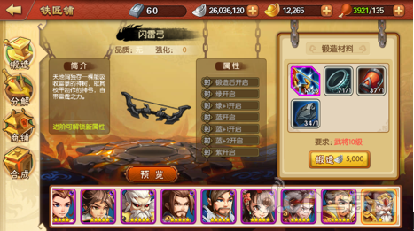 完成普通战役3-5后,就能进入“铁匠铺”内打造神兵啦~神兵需要使用特定的材料进行锻造,其中最稀有的材料就是各武将神兵的碎片,神兵碎片需要在时空塔内才可获得。