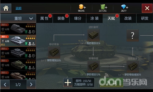 《钢铁雄狮》新增天赋技能,让你的坦克“天赋异禀”!诸如游戏中深受军迷喜爱的虎王、鼠式、豹式等二战最具名气坦克,天赋技能正好叠加该坦克定位属性!比如,原本血厚的鼠式坦克天赋前三级均大百分比增加血量;防御超强的虎王大百分比增加穿甲防御、炮火防御;以穿伤和高射速为输出的豹式大幅提升穿甲伤害和射速。此类能单独且极大提高某一属性的天赋是最有潜力的天赋技能,老司机可根据情况优先对此类坦克的天赋进行升级!