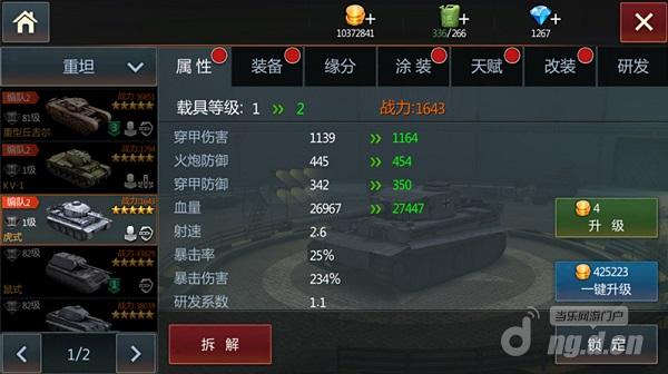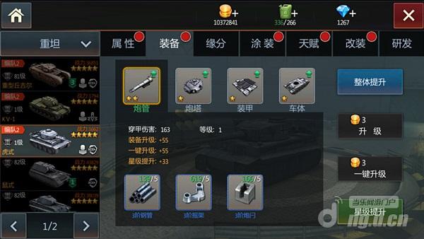 同样,坦克装备也需要及时升级。坦克装备最大等级与坦克等级相等,坦克升级完成后也需要对坦克的装备进行升级操作才能发挥坦克的基本属性作用。