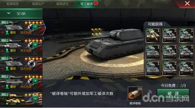 简单点说,它可以从低等级坦克中破解出高等级坦克的碎片。举个例子,比如你得到了一辆虎式坦克,又很想拿到鼠式坦克怎么办?你可以用破译卷轴对虎式进行军工破译来得到鼠式坦克的碎片。