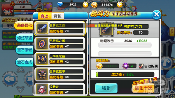 而强化我有一个小建议就是以10级强化等级为单位,将装备强化起来。要注意的是,让各装备同时强化起来,不要出现其中一件强化等级很高,另外一件却强化等级很低的情况,因为强化等级越高,强化装备需要的金币以及强化石头的等级和数量都是更多的。