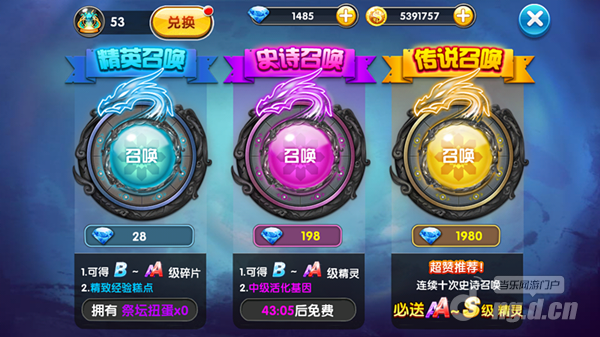 关于祭坛召唤需要注意的一点是,关于史诗召唤和极品占星,我建议使用每天免费赠送的次数,而不要使用钻石去抽奖。而钻石我们则留给10连抽。如果你不打算10连抽的话,那么慢慢存碎片换成宠物也是可以的,但是速度会比较慢。
