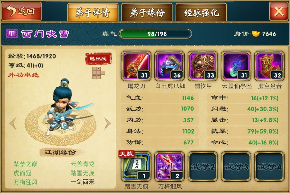 真气:弟子的真气值决定了能够装备武学的数量,越高级的武学需要占用越多的真气值。真气值随着弟子等级提升而提升。
