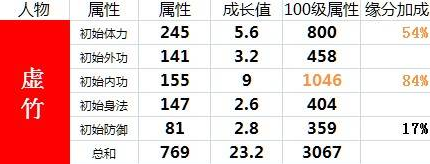 虚竹的缘分貌似都是加血加内,其中内力加的尤其恐怖,是所有甲弟子里面内力加成最变态的,更变态的是虚竹本身内力成长达到9,很明显虚竹就是一个内力高的离谱的家伙,目前已知的甲弟子里面除了王重阳,就算虚竹内力最高了。也许你会说内力高有什么用?大不了就出现多几次化解伤害。是的,当这个用在虚竹身上就说不过去了,因为虚竹拥有极度变态的天赋技能--“天山六阳掌”,虽然单体,但威力高,配高内力使用威力更加高!重点是极易触发!根据我的测试,虚竹使用该技能的触发率达到60%以上,一出手对方就差不多挂了,另外值得注意是,虚竹防御也不低哦,2.8的成长可以排前三了。虚竹是个杀手,出手就要见血,可以用内力版的西门来形容他,发展方向就简单多了,就堆内力,给我疯狂的加内力!!这对于非r玩家或者无脑玩家是一个非常不错的弟子!(貌似成功抽到虚竹的人不多,难度不低于西门哦)