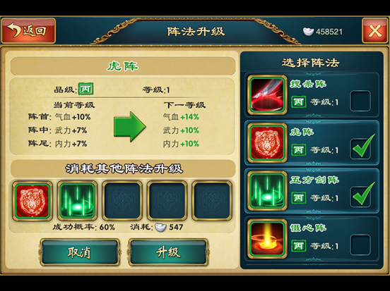 所有阵法可通过消耗其他阵法来提升等级,最多可一次消耗5个阵法,升级成功率和消耗的阵法品质及等级有关。升级成功率上限为60%。