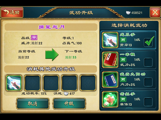 所有武学可通过消耗其他武学来提升等级,最多可一次消耗5个武学,升级成功率和消耗的武学品质及武学等级有关。升级成功率上限为60%。