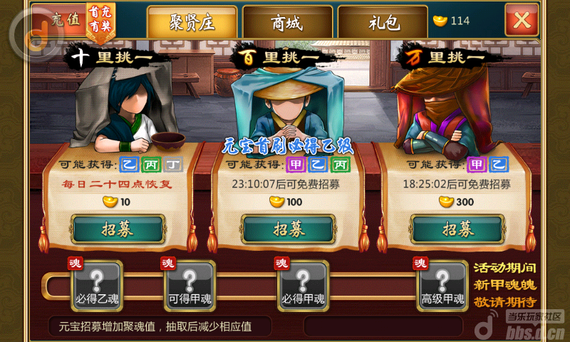 这时要进入市集,如果把前期可以领取的奖励和礼包等都领取了,这时你的元宝数应该还可以,那就去花300元宝招募招募“万里挑一”的弟子卡牌。因为第一次花元宝购买,是肯定会招募到甲级弟子卡牌的。(如果你到了可以免费招募的时间,也可以碰碰运气,但出甲级卡牌得几率不大)