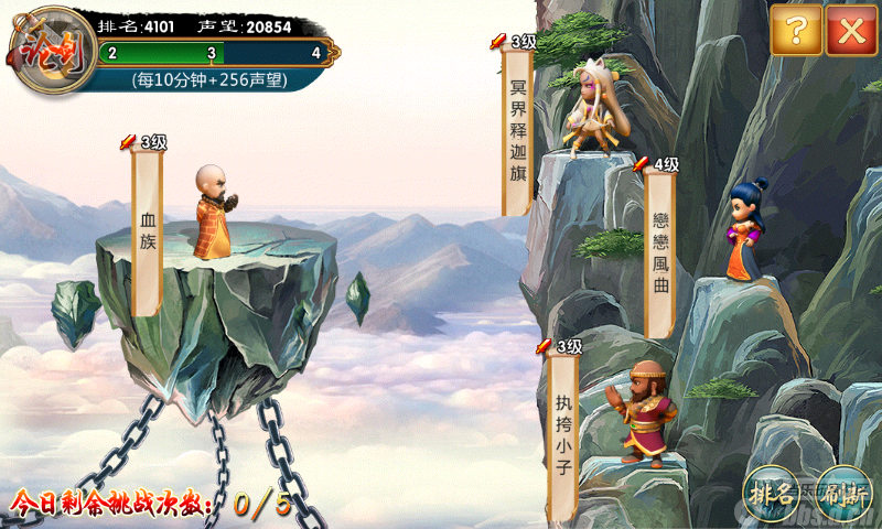 进入论剑系统后,系统会挑出三个排名和你差不多的对手供你选取挑战。你也可以向下滑动屏幕,看看高等级的对手,但就不要浪费次数去挑战了,获胜的几率基本为0,就从这三个对手中选择。