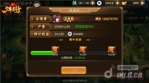 《少年名将》丰富的矿脉资源共分钻石矿、金矿、银矿、铜矿、铁矿这几种品质,想要更多的资源,那必然是选择品质最高的钻石矿脉,使用元宝将占据时间延长,产出更多资源,获得最大收益。小编再告诉各位一个小窍门,3个以上同军团成员占领同一页的矿脉可获得产量加成哟。