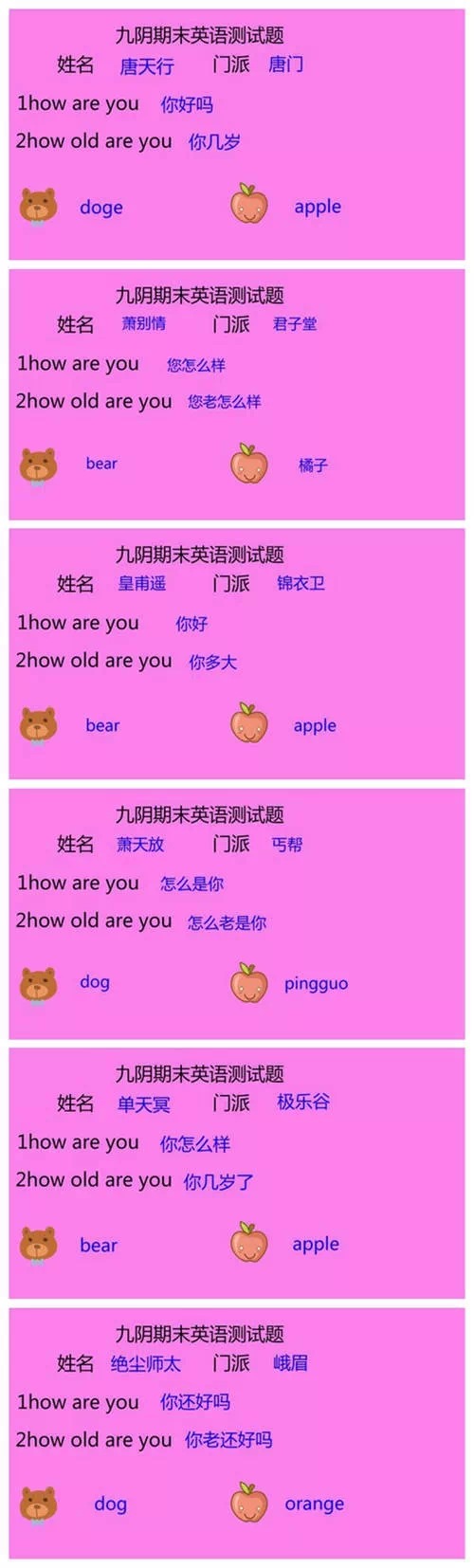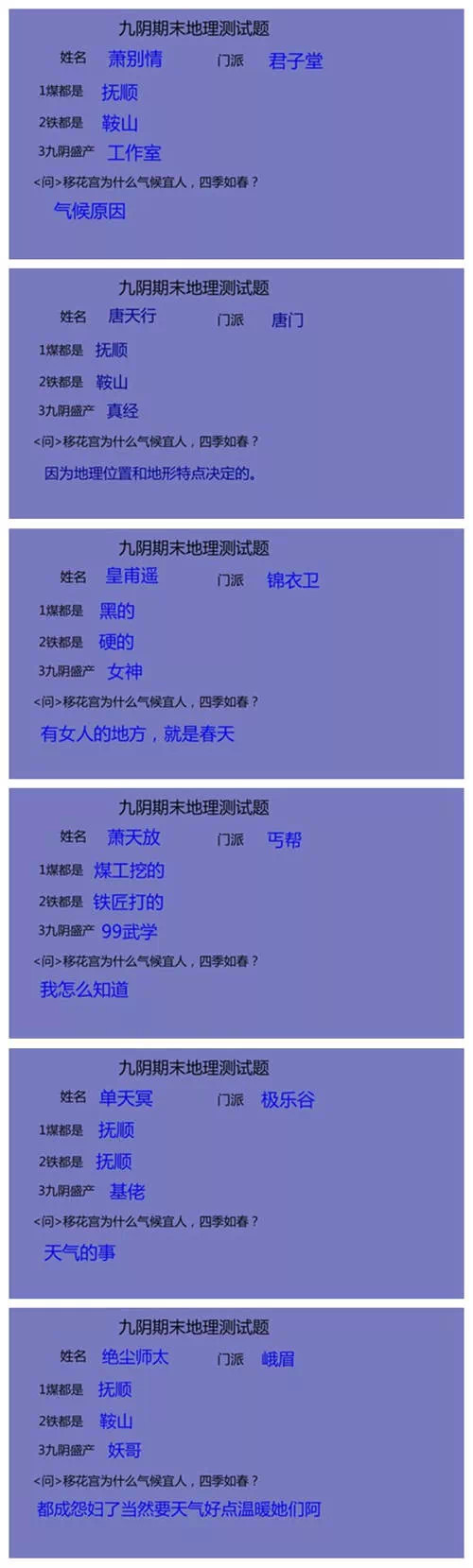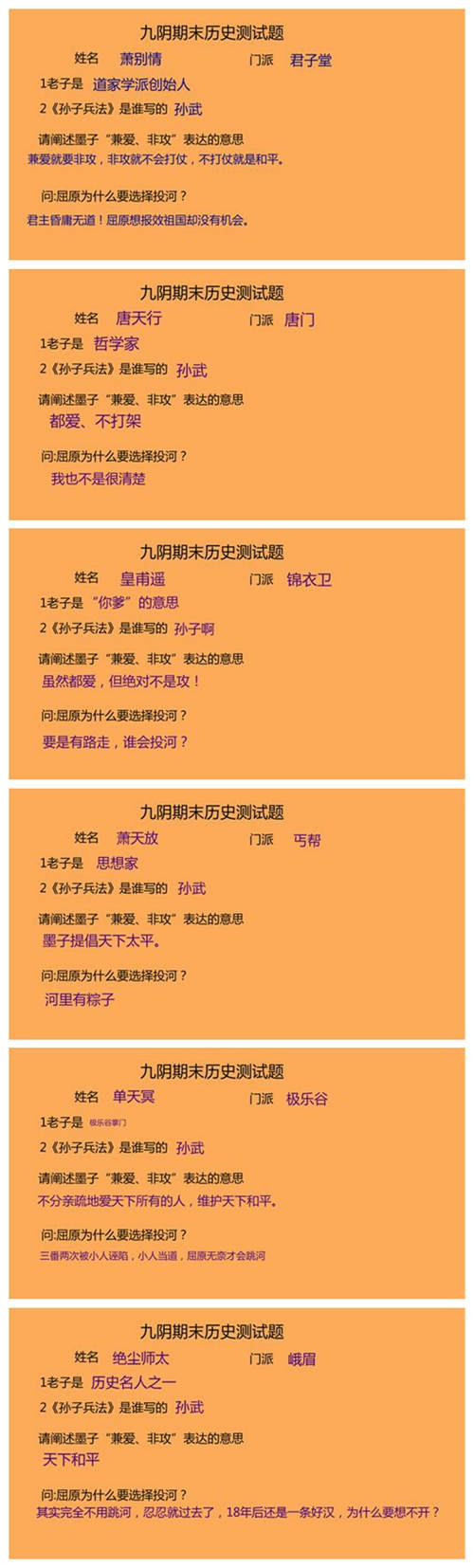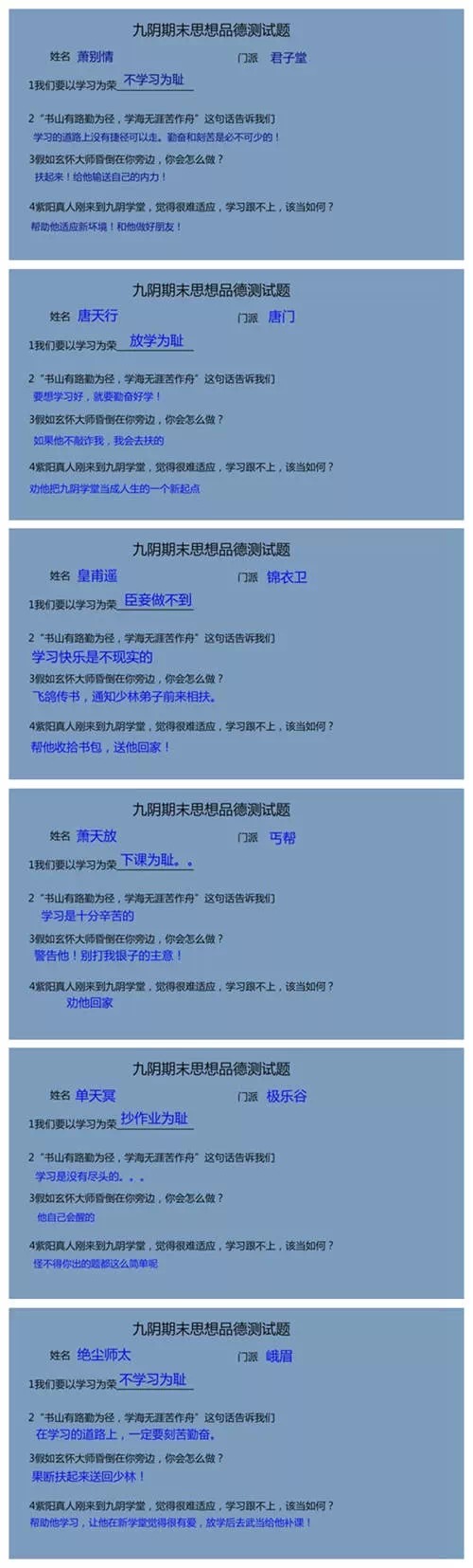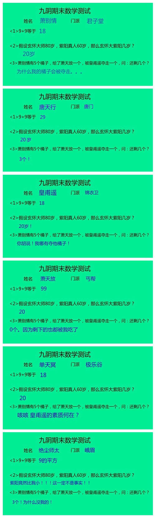 又到一年期末时,想必许多同学都在为考试而奋斗,每日贪黑起早去图书馆背书做题,当真辛苦!然而当同学们刻苦复习(预习)的时候,九阴真经的期末考试也正在进行中,参加此次考试的有君子堂、唐门、锦衣卫、丐帮、极乐谷、峨眉的掌门。那么他们到底是过是挂,是拿奖学金还是补考呢?容我们一同来当一回阅卷老师!