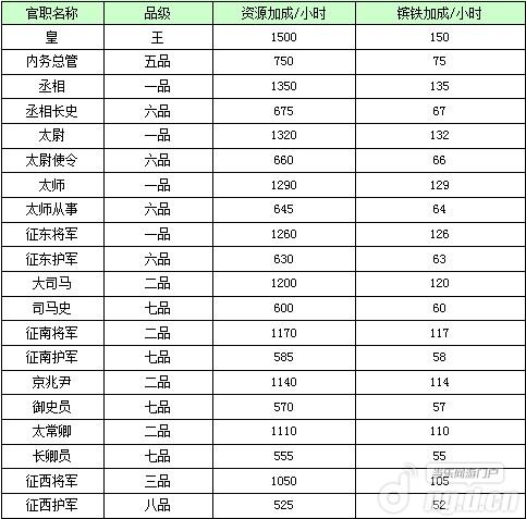 在玩家沙场称雄的同时也可在朝野中尽显自身实力,挑战争夺高官厚禄。官职对玩家自身的资源产量有增益效果,官职越高对自身资源的产出帮助越大,另外越高的官职每天可以领取的银币俸禄也相应增多。
