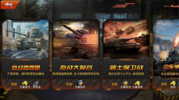 战役玩法由主界面的“战役”入口进入,内含丰富的战役玩法模块,¨按玩家等级和副本进度依次开放能源矿井、血战西西里、血战大裂谷、领土保卫战、中东争夺战等玩法,大量资源奖励等你来挑战。